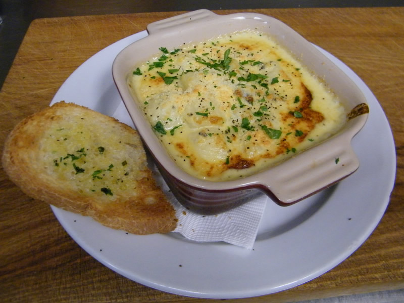 Homemade potato dumplings in a creamy blue cheese sauce